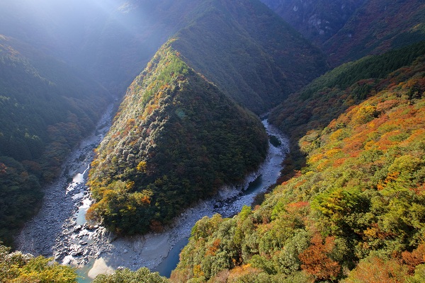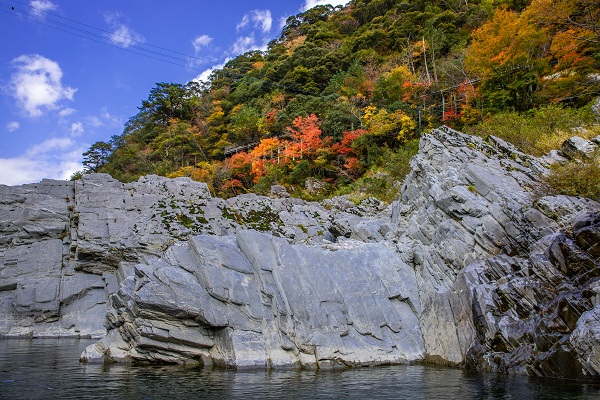 “Oboke and Koboke” are V-shaped valleys, approximately 8 km long, formed by the Yoshino River deeply eroding the Shikoku Mountains. The contrast between the emerald green water and the vibrant red and yellow autumn leaves of maples and other trees adorning both banks is breathtakingly beautiful. Viewing the autumn colors from a sightseeing boat is particularly exceptional.