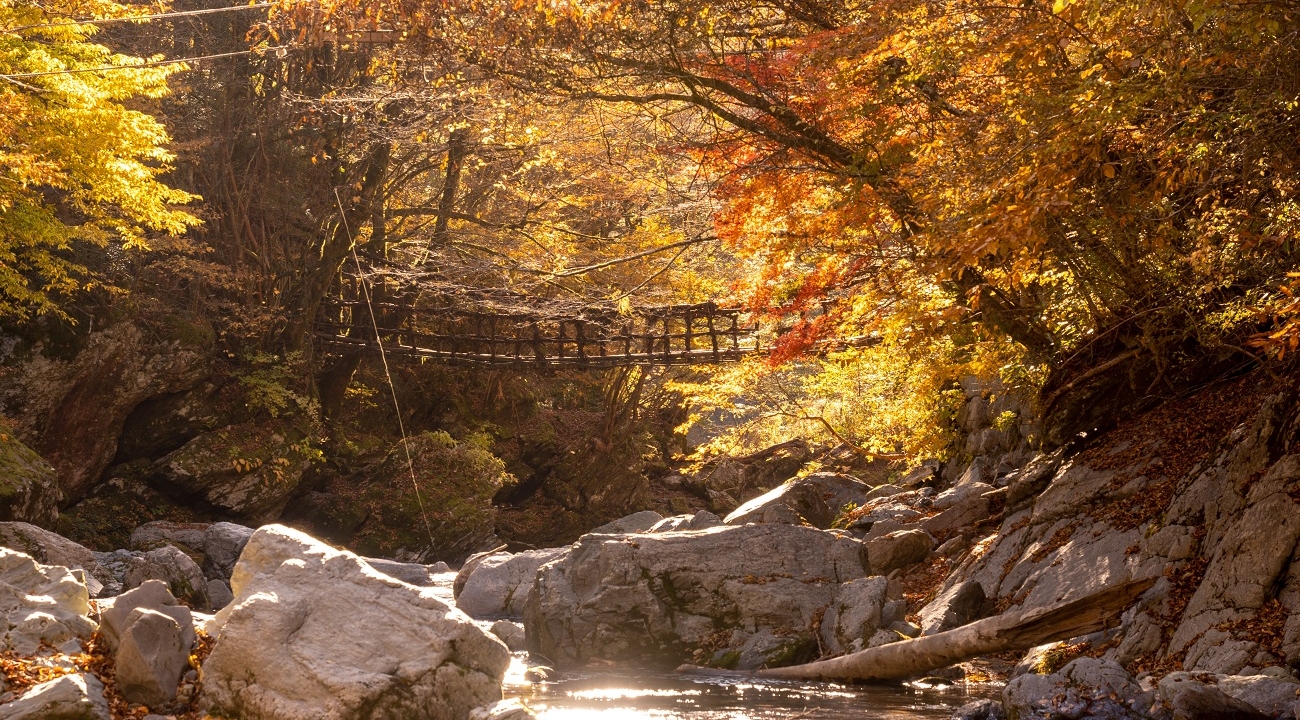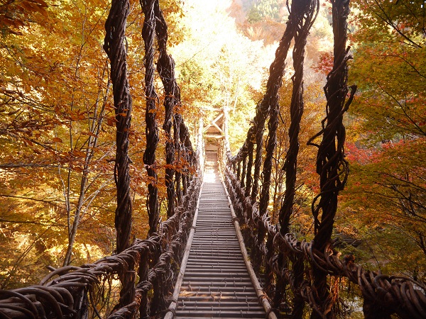 Counted as one of Japan’s three hidden regions, “Iya Valley” is a mystical place surrounded by deep V-shaped valleys. The autumn foliage, especially around the “Kazurabashi Bridge,” paints the entire valley in fiery reds and yellows, further enhancing its secluded atmosphere. You can enjoy the surrounding spectacular views while crossing the thrilling Kazurabashi Bridge.