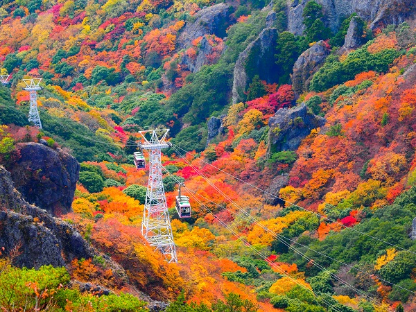 ロープウェイは必須です!空中から見下ろす紅葉の絨毯は感動的で、瀬戸内海の多島美とのコントラストが最高です。山頂ではもみじ葉エキス100%のもみじサイダーを飲みながら紅葉鑑賞をしてみてください。