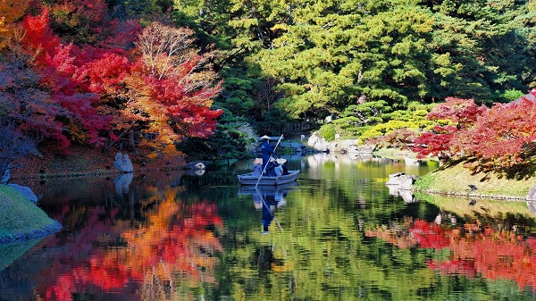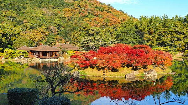 国の特別名勝に指定されている栗林公園は、約400年の歴史を持つ回遊式大名庭園です。紫雲山を借景とした美しい庭園では、カエデやハゼノキが色づき、池に映る紅葉が絶景を生み出します。