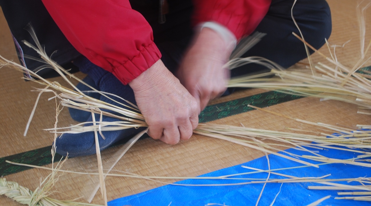 Straw crafting experience under the Yokai ceiling painting by Shigeru Mizuki